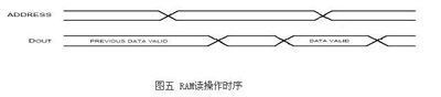 对SRAM进行读操作相对较简单,在进行读操作期间,始终为低电平,始终为高电平。每进行一次读操作,地址按系统要求变化一次。同时注意,地址的变化时刻总要先于数据的变化时刻。图五为RAM读操作时序。